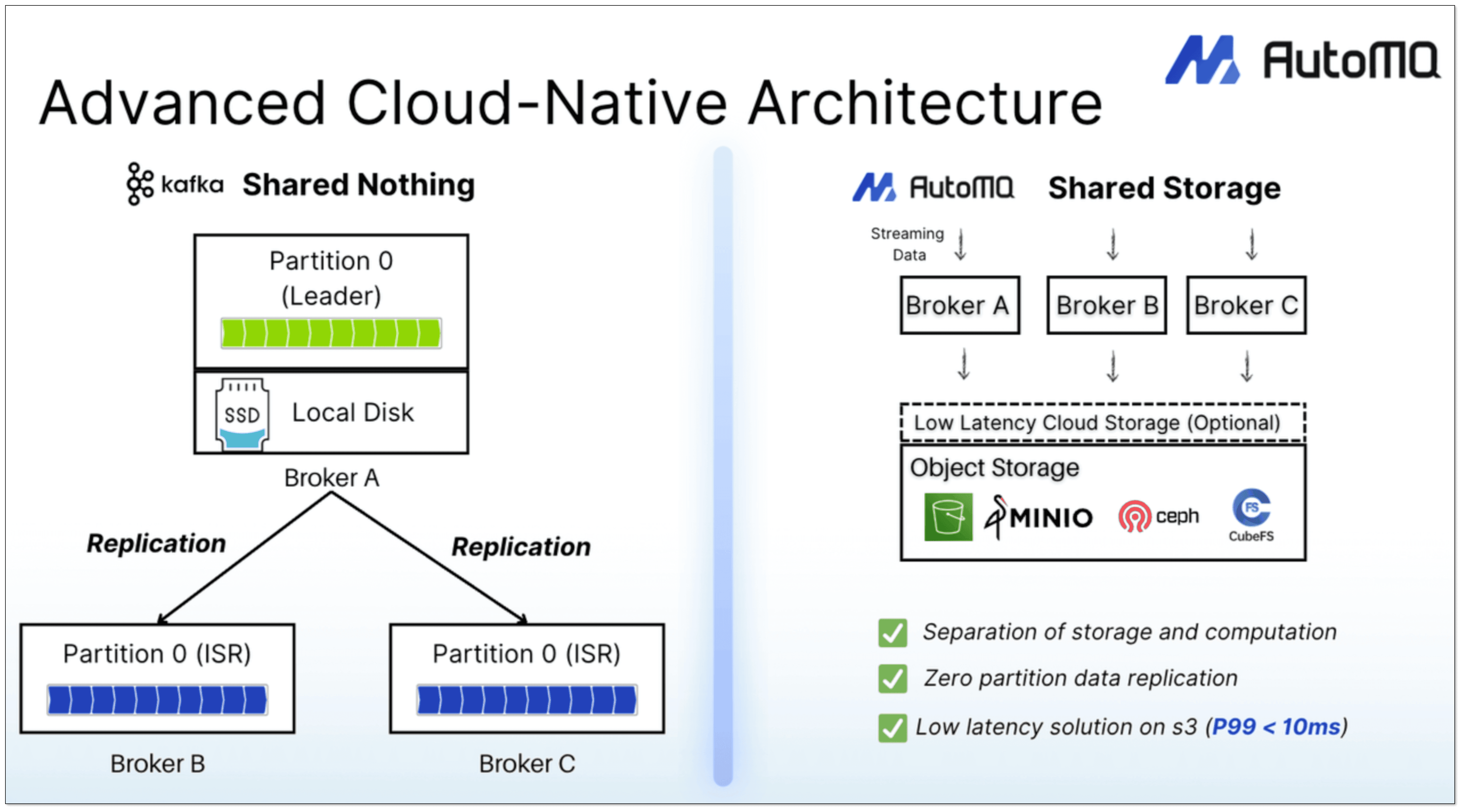 By decoupling compute and storage via a shared storage architecture, AutoMQ offers: