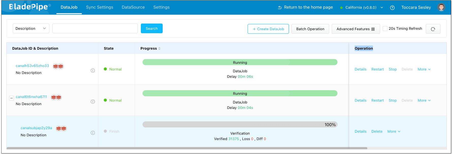 - Start the DataJob. Forward and reverse DataJobs are running with sub-second latency.