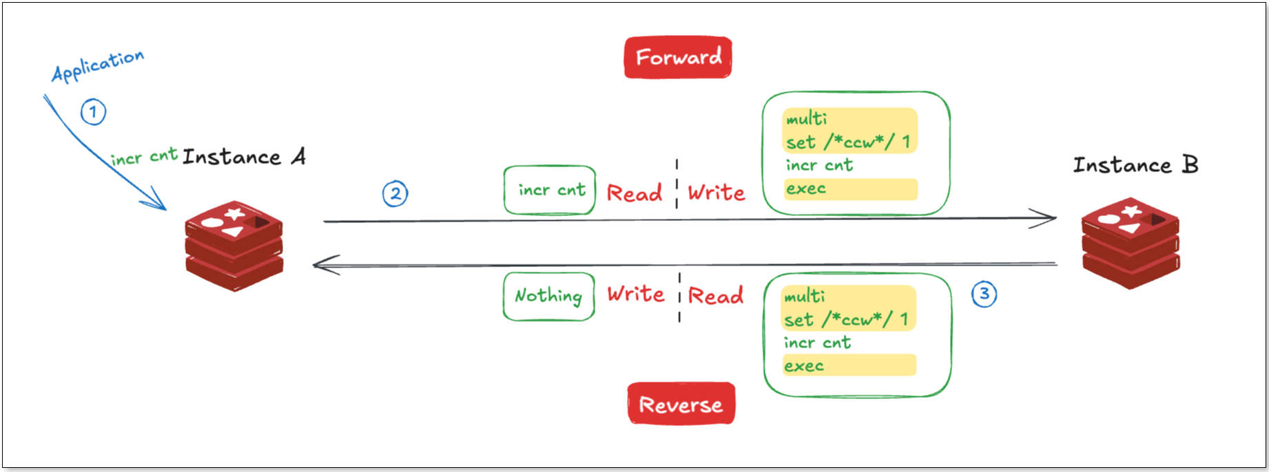 - Ambiguity in edge cases: In certain extreme scenarios, such as when an application performs similar write operations on the target instance, the reverse sync task may have difficulty distinguishing the source of the commands, which could lead to false positives or even a lost update.