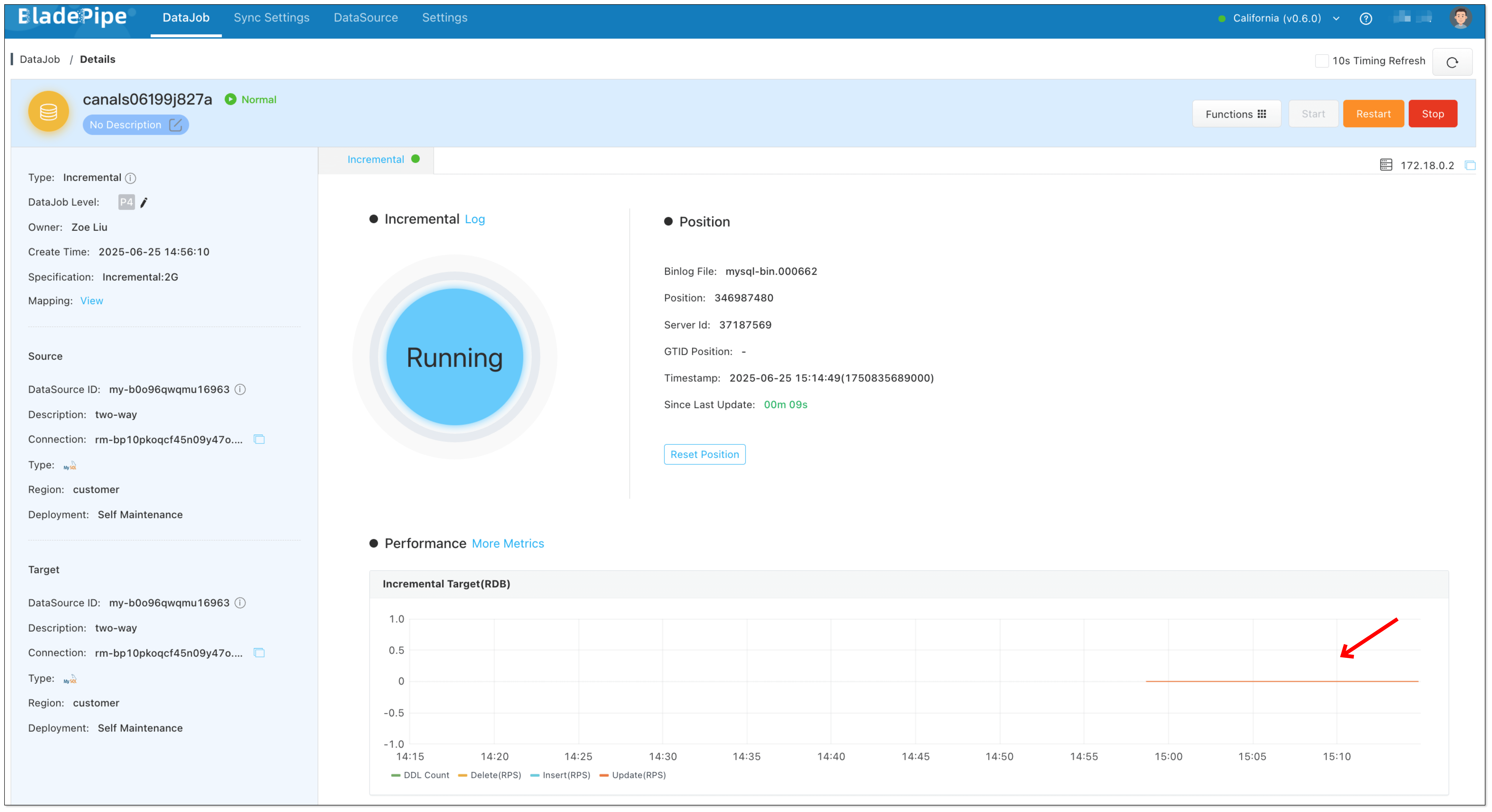 - Do some DMLs in the source database. You can see there are changes in forward DataJob monitoring charts but no changes in reverse DataJob.