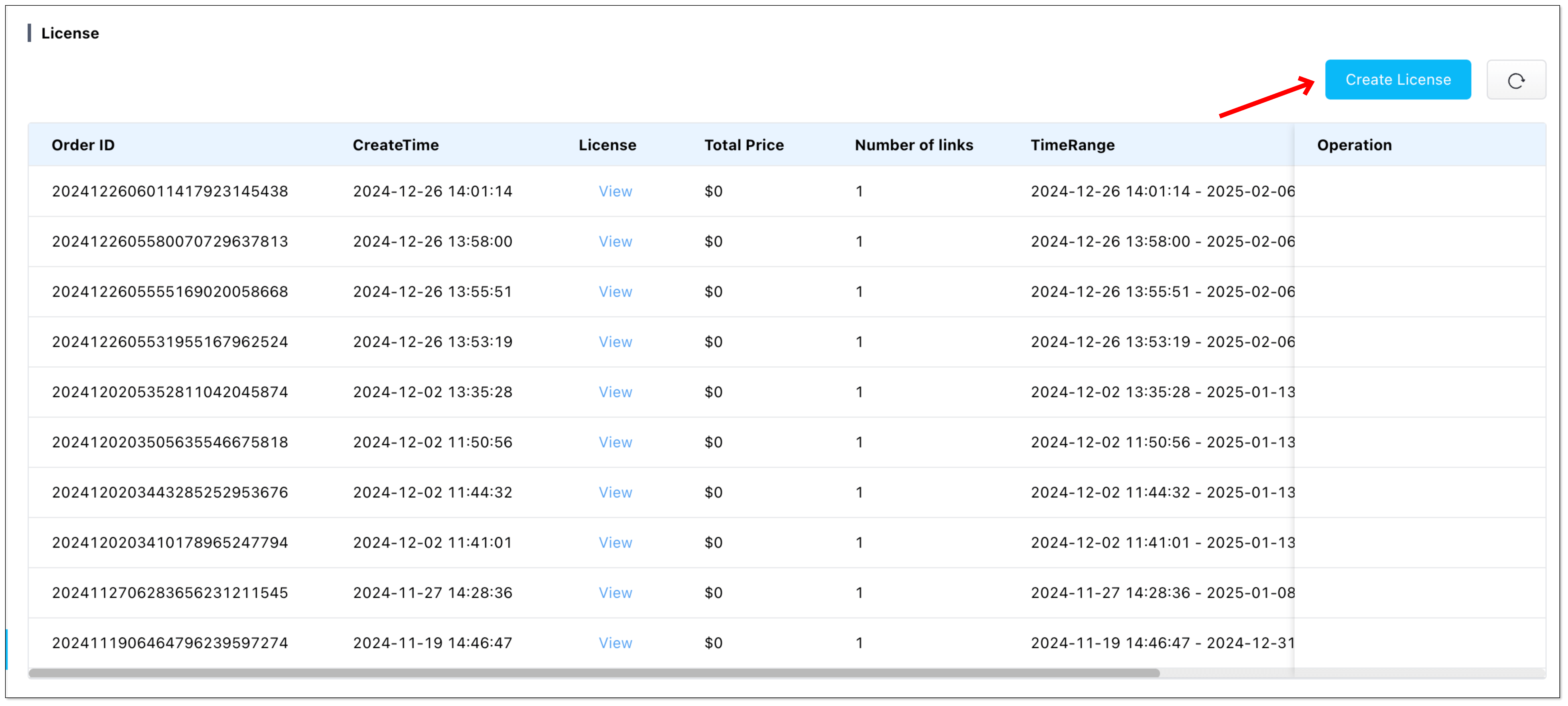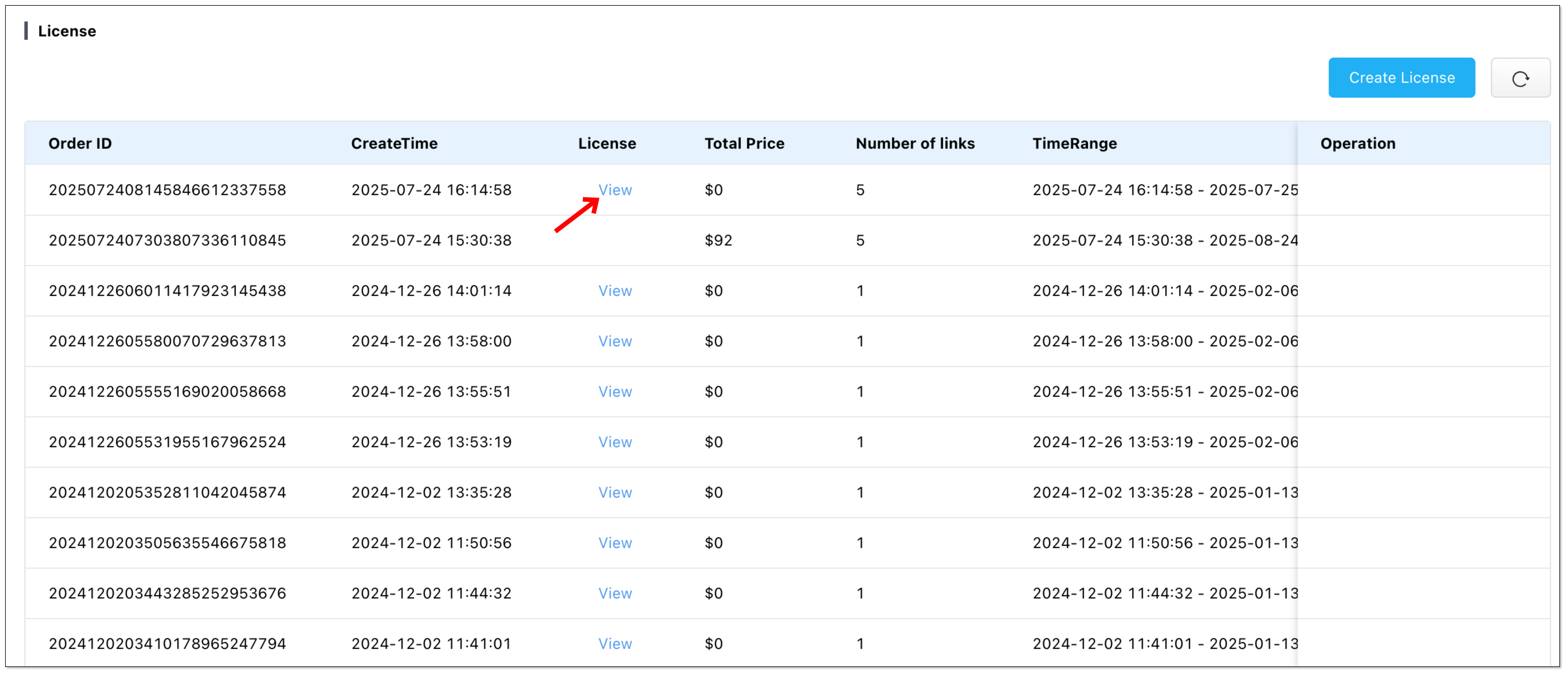 - Click Create License in the upper-right corner.