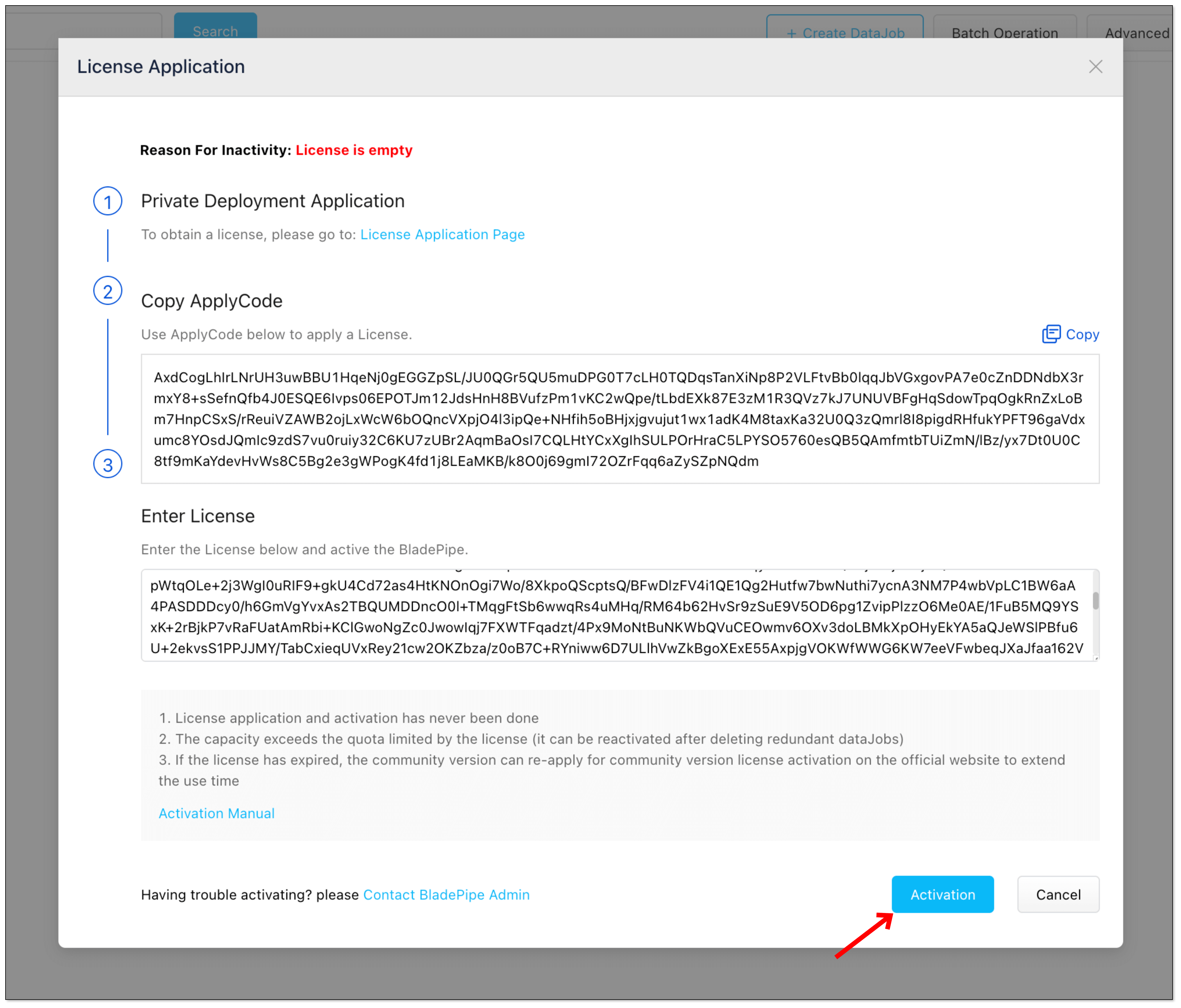 - Log in to the Console of BladePipe On-Premise and click Inactivated in the upper-right corner.