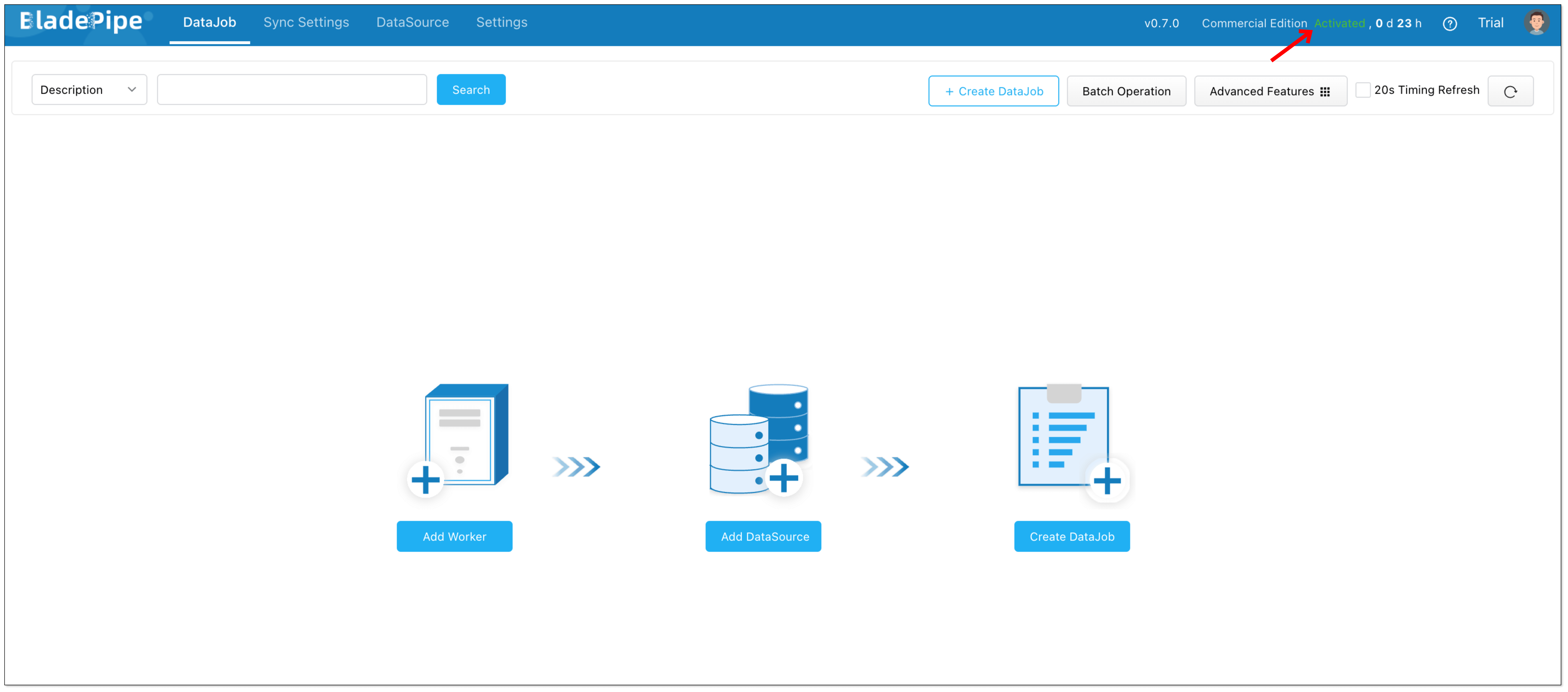 - If you activate BladePipe successfully, "Activated" will be shown in the upper-right corner.