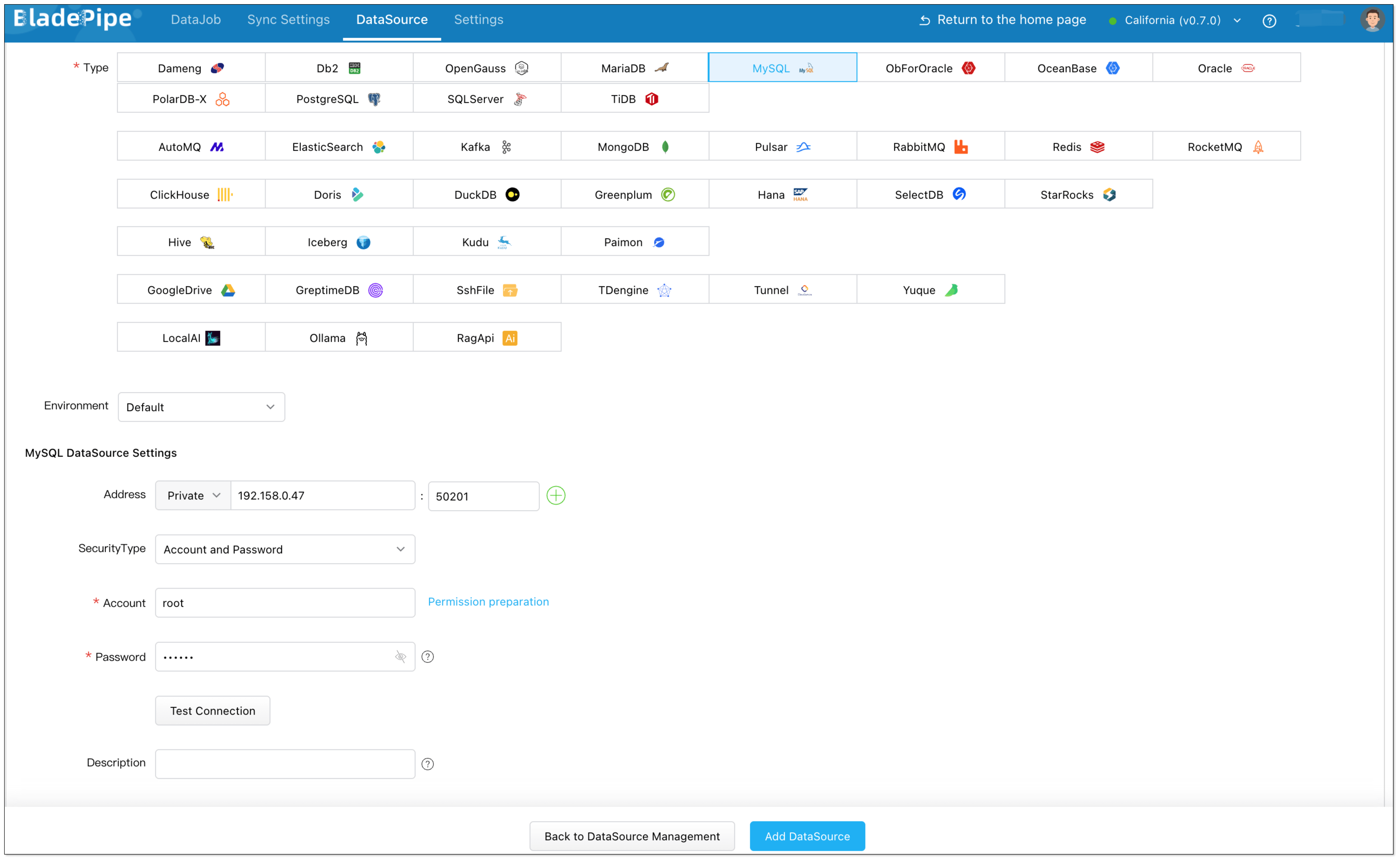 Here we use a self-managed MySQL DataSource as an example. For more details, see Add Self-managed DataSource. For the other supported DataSources, see Supported DataSources.